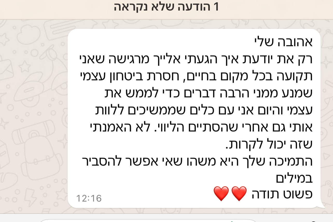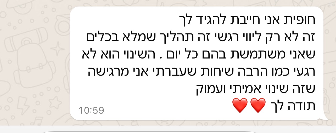 אני לא רק מלווה אותך בתהליך, אלא נשארת לצידך גם מעבר למפגשים, עם תמיכה בווטסאפ ומענה לכל שאלה